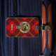 Insignia escudo Clan Wallace rodeada por una correa y hebilla sobre el fondo tartán. Texto personalizado en ambos lados.