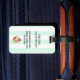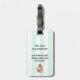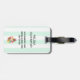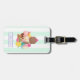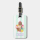 Una etiqueta de equipaje personalizada ilustrada con el dibujo de un helado de 3 cucharas con rociadas de colores. Un cono de helado con cucharas de chocolate, fresa y vainilla. Un bol de helado neopolitano con una cereza encima. Fresas y una piña se sientan al lado de las cuencas. Summery y dulce. Patrón de rayas verdes y blancas en el fondo.