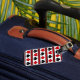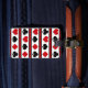 Conjunto de iconos de palos de cartas aislados sobre fondo rayado negro, rojo y blanco