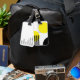 Ilustracion de diseño abstracto con formas geométricas (círculos y rayas) en tonos amarillos y negros sobre fondo blanco.