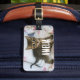 Una etiqueta para el equipaje con una graciosa fotografía de un gato enmascarado. El pelo en la espalda levemente levantado y tiene una expresión sorprendida en la cara. Agradable y adorable. Te hace sonreír. :)