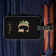 Elegante etiqueta de equipaje negro con un monograma botánico dorado en el centro.