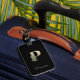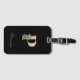 Elegante etiqueta de equipaje negro con un monograma botánico dorado en el centro.