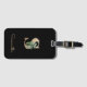 Elegante etiqueta de equipaje negro con un monograma botánico dorado en el centro.