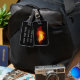 Una brillante pluma de pavo real hecha de fuego y llama sobre fondo negro.