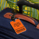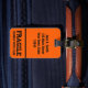 La etiqueta del equipaje o del bolso en naranja con el texto, "frágil, dirige con cuidado".