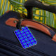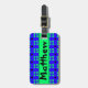 blauw met groene en zwarte stippen. Met je eigen naam erop