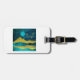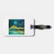 Resumen de diseño de paisajes montañosos en tonos audaces de oro, cian y azul con un amanecer, estrellas y pájaros.