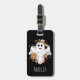 Una etiqueta de equipaje con el ilustracion de un fantasma sonriente. Decorado con flores, arcos de lluvia y murciélagos.