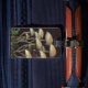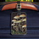 Un cuadro pastel de un bonito racimo de setas adorna esta etiqueta de equipajes única.