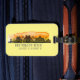 La elegante etiqueta para el equipaje incluye Huntington Beach, la silueta de la ciudad de CA con coordenadas de latitud y longitud y un lavado de color acuático con puesta de sol naranja
