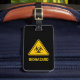 Signo de advertencia del triángulo de riesgo biológico. Texto personalizado. Fondo de patrón sin inconvenientes en la parte trasera.