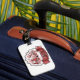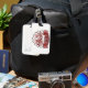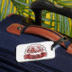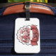 Toldo, árboles y cinta de "Camping". Insígnia dibujada a mano con tinte de acuarela roja