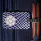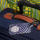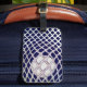 Bolsa de equipo Lacrosse o etiqueta para el equipaje con diseño de malla y bola flojos sobre fondo azul marino.
