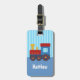 Un ilustracion lindo y colorido de un tren en colores primarios del amarillo, del rojo y del azul con las rayas verticales azules claras para el fondo. Para los muchachos que aman los trenes del juguete y la alineación de pistas ferroviarias, amarán esta etiqueta del equipaje personalizada en su nombre.