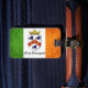 emblema del escudo de armas de la familia MacDermott en una bandera irlandesa desgastada