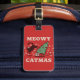 Ilustracion de estilo retro con diseño de texto "Meowy Catmas" y lindo gato negro, árbol de Navidad, copos de nieve, regalos, patas y estrellas decoración