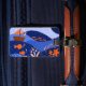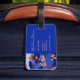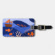 This luggage tag features a vibrant, stylized landscape with a whimsical and modern aesthetic. It uses a rich color palette of deep blues and orange an to create a layered, multi-dimensional scene with imaginative details, including flying fish, birds, a small sailboat, and coral reefs. The design is characterized by clean lines and high-contrast colors that give it a playful yet sophisticated feel.