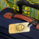 Cara de sol celeste con fondo geométrico de bloques de color y personalizable de texto marrón dorado para monograma