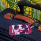 Arte pop de una mujer con gafas de sol blancas mordiendo sus labios rosas