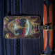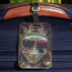 This oil painting from Amanda Diehl features a Venetian jester mask brandishing an enigmatic smile. The mask, adorned with glazed black and candy-apple red diamonds surrounded by gold scrollwork, floats on a field of burgundy damask.