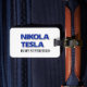 Nikola Tesla es mi superhéroe. Gráfico de texto en negro y azul con relámpago blanco.