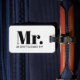 Viaje en estilo con esta etiqueta masculina del equipaje para los novios y los recienes casados. Características del este diseño un fondo del falso cuero negro con "Sr." y de su apellido en una tipografía gris clara moderna de la escritura. La parte posterior de la etiqueta del bolso tiene sus detalles del contacto para que usted personalice en gris claro en un fondo negro de la imitación de cuero. Diseñado por el artista Coffey ©Susan.
