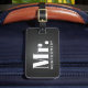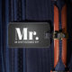 Viaje en estilo con esta etiqueta masculina del equipaje para los novios y los recienes casados. Características del este diseño un fondo del falso cuero negro con "Sr." y de su apellido en una tipografía gris clara moderna de la escritura. La parte posterior de la etiqueta del bolso tiene sus detalles del contacto para que usted personalice en gris claro en un fondo negro de la imitación de cuero. Diseñado por el artista Coffey ©Susan.