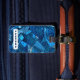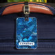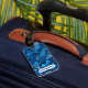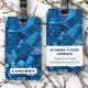 Etiqueta para el equipaje con un patrón abstracto y geométrico en tonos azules y de tu nombre. Información de contacto en la parte posterior.