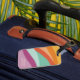 La etiqueta de equipaje Boho Colorful Abstract Retro Name incluye colores alegres y brillantes, incluyendo lavanda, agua, verde azulado, naranja, coral y amarillo.