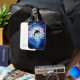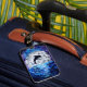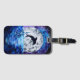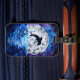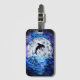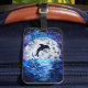 una acuarela decorativa con una gran luna blanca que desciende casi al océano nocturno cuando un delfín salta al aire justo delante.