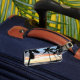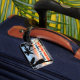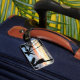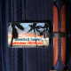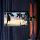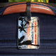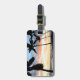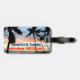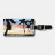 Etiqueta de identificación tropical del equipaje del viaje con el área de la plantilla del texto para el nombre y el número de teléfono de contacto. El diseño del fondo es una costa costa con las palmeras resumidas por una puesta del sol viva.
