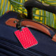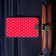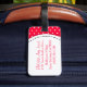 El equipaje rojo brillante marca la etiqueta de identificación con nombre de colores brillantes para ayudarle a encontrar a su funda. Personaliza con tu nombre y dirección completa al revés. diseño de bonito con un sencillo patrón de puntas de polka rojo y blanco diseñado de manera única por la diseñadora Sarah Trett.
