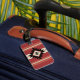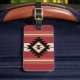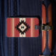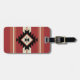 Patrón bohemio étnico azteca con formas geométricas en rojo, naranja, gris y negro sobre fondo rayado