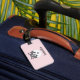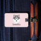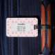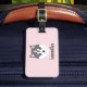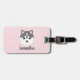 Esta etiqueta de equipaje de doble cara muestra el ilustracion de un cachorro Husky Siberiano de ojos azules. Este perro está puesto contra un fondo rosa claro. Personalizar esta etiqueta de equipaje con tu nombre, número de teléfono y dirección.