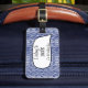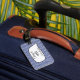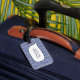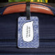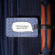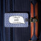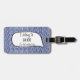 El equipaje personalizado marca con etiqueta para él. Con el modelo geométrico en azul.