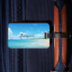 Este moderno diseño de etiquetas para equipaje cuenta con una playa de océano azul