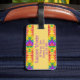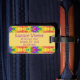 Esta divertida etiqueta para el equipaje cuenta con remolinos de tinta cortada separados por un borde morado donde puede poner su nombre. Al revés, pones tu nombre completo, dirección y número de teléfono en un fondo morado con una fuente amarilla. Las fronteras están tiñdas.