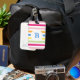 Rainbow colored candy stripes on monogrammed luggage tag.