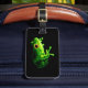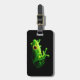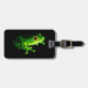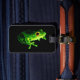 Una rana verde fracturada con ojos naranjas feroces contra un fondo negro.