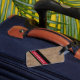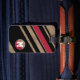 Diseño gráfico y moderno a rayas para un viajero elegante, personalizado con su inicial en un círculo con rayas diagonales... para identificar su equipaje y viajar con estilo.