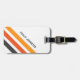 Etiqueta para el equipaje con tres rayas diagonales en gris oscuro y dos tonos de naranja sobre fondo blanco y tu nombre personalizado en un tipo de letra negrita y serif moderno. Añade tu información de contacto en la parte posterior.