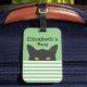Un diseño caprichoso de etiquetas de equipaje con un gráfico estilizado de un curioso gato negro mirando al mundo, como lo hacen los gatos curiosos! Los ojos del gato son un color dorado para un acento de color añadido. Su nombre está puesto encima del gráfico con la palabra "Bolsa" debajo de su nombre para personalizar su etiqueta de equipaje. El fondo es verde con rayas verdes y blancas. Una divertida etiqueta de equipaje colorido para destacarse de la multitud, o una gran idea de regalo sobre la temática de los gatos para el amante de los gatos en tu vida que viaja mucho.