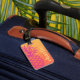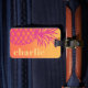 Etiqueta portaequipajes con una piña rosa caliente y tu nombre o texto personalizado alineados verticalmente a la derecha en un fondo degradado de amarillo a naranja.