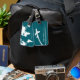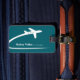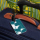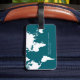Un diseño sencillo y moderno para identificar sus pertenencias cuando viaja por el mundo. Plano blanco sobre un fondo azul con tu nombre en la parte delantera, y cita personalizado 'aquí vamos otra vez'... con información adicional en la parte trasera, con un mapa gráfico del mundo.