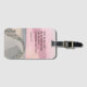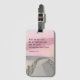 La etiqueta del equipaje cristiano representa una acuarela simple y moderna con cielos rosas sobre un océano gris, pasarela de playa. Presenta un salmo motivador de la Biblia Verse 27:14, "Esperen al Señor; Sean de buen valor, y Él fortalecerá tu corazón".