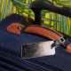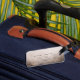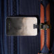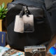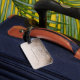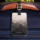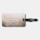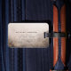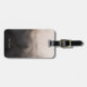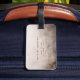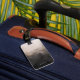 Etiqueta de equipaje personalizada que incluye tu nombre en la parte superior de un fondo de color negro oscuro y marfil.