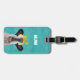 La parte delantera de estas etiquetas de equipaje está lista para ser personalizada con un conjunto de iniciales y muestra mi ilustracion pintado de una vaca con un arco amarillo puesto contra un fondo azul turquesa. El reverso tiene ilustraciones de flores de gloria matutinas y está listo para ser personalizado con tu nombre y detalles de contacto en la coordinación de las letras azul turquesa.