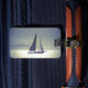 Barco de vela a la salida de la costa de California en Huntington Beach con la silueta de la isla Catalina al fondo.