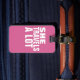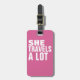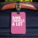 Diseño de tipografía divertida y femenina con el negrita blanco "ELLA VIAJA MUCHO" en una etiqueta rosada, y con información adicional en la parte de atrás... para una mujer que siempre viaja. Una etiqueta para el equipaje con su nombre es importante por varias razones prácticas cuando se viaja. En primer lugar, sirve como una manera rápida y fácil de identificar tu equipaje entre el mar de bolsas similares en aeropuertos, estaciones de autobuses u otros centros de transporte. Esto puede ahorrarle tiempo y reducir el riesgo de tomar accidentalmente el bolso de otra persona o de que otra persona tome el suyo. En segundo lugar, una etiqueta de equipaje con su nombre proporciona un enlace de información de contacto crucial en funda que su bolsa se pierde. En el desafortunado caso de que su equipaje esté fuera de lugar durante su viaje, tener su nombre y los datos de contacto en la etiqueta facilita mucho la reunión de los pasajeros con sus pertenencias. Esta simple medida aumenta las posibilidades de un proceso de recuperación rápido y preciso. Además de las ventajas prácticas, un equipaje con etiqueta de nombre también añade una capa de seguridad. Al mostrar claramente su nombre, disuade a los posibles ladrones o a los que tengan bolsas similares de intentar reclamar o abrir su equipaje.
